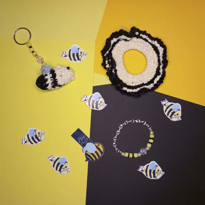 Ik ben een pakket aan het maken met een bijen thema. Er zitten verschillende producten in met bijvoorbeeld een bijen patroon, zoals een scrunchie.